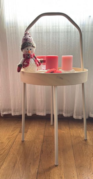 Mesa auxiliar con un diseño moderno y funcional. - Tablero de madera. - Patas de metal. - Combinación de colores marrón y rosa.