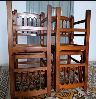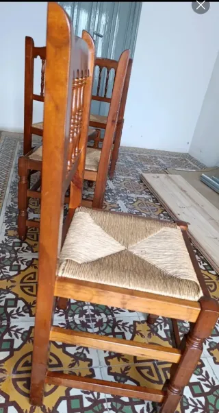 Se vende conjunto de cuatro sillas de comedor con un diseño rústico por cambio de decoración. Recoger en Villacarrillo En dos de las sillas se dió una mano de barniz incoloro, falta por darle a las otras dos para disimular pequeñas imperfecciones que se pueden ver en las ultimas fotos - Fabricadas en madera resistente. - Acabado en color marrón. - Asientos de mimbre. - Respaldo con barrotes decorativos.