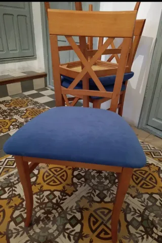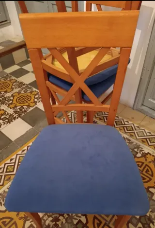 Se vende conjunto de cuatro sillas de comedor por cambio de decoración. En muy buen estado Recoger en Villacarrillo - Estructura de madera resistente. - Asiento tapizado en tela azul. - Respaldo con diseño cruzado.