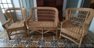 Se vende conjunto de muebles de jardín de mimbre. Compuesto por un sofá, dos sillones y mesa Recoger en Villacarrillo Tiene pequeños desperfectos, se adjunta en últimas fotografías