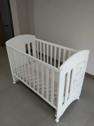 Cuna de bebé en color blanco con un tierno diseño de osito. - Lateral con dibujo de osito - Ruedas para facilitar su movilidad. - Estructura de madera. - Diferentes alturas.