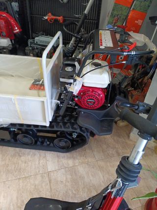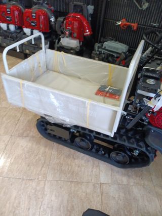 Carretilla de oruga con motor Honda. - Motor Honda GX200. - Capacidad de carga de 350 kg. - Transmisión manual. - Ideal para trabajos en terrenos irregulares.