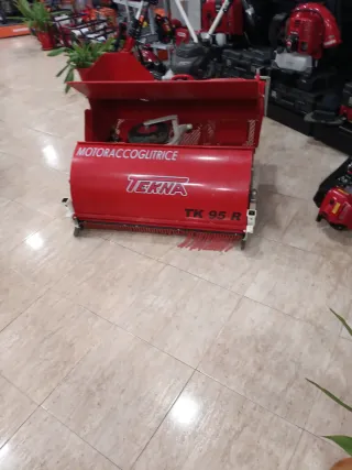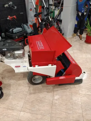 Recogedor de aceituna de la marca Tekna, diseñado para facilitar la recolección. - Color rojo y blanco. - Ruedas para movilidad. - Motor de combustión.