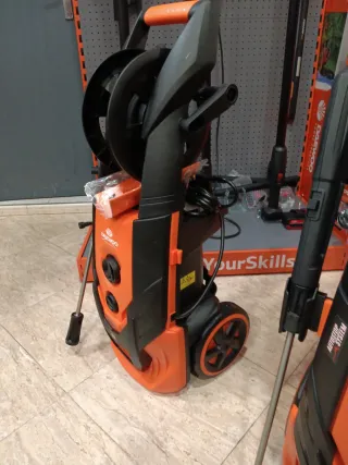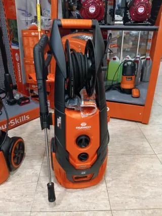 Hidrolimpiadora Daewoo de alta presión, ideal para limpieza exterior. - Potencia de 2500W. - Función ECO para un consumo eficiente. - Sistema Auto Stop. - Color naranja y negro.