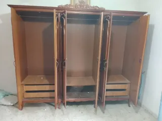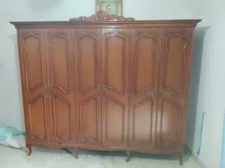 Armario de madera con un diseño clásico y elegante. Sus puertas presentan detalles tallados que le dan un toque distintivo. - Seis puertas. - Tiradores metálicos dorados. - Patas curvas.