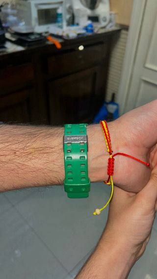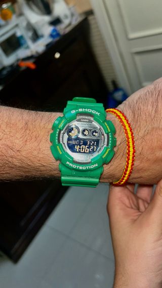 Reloj Casio G-Shock con un llamativo diseño. - Correa de goma verde. - Esfera con detalles en plateado y blanco. - Pulsera adicional multicolor.