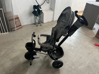 Triciclo infantil de color gris, ideal para paseos. - Estructura resistente. - Asiento acolchado. - Barra de seguridad. - Reposapiés. - Cesta de almacenamiento.