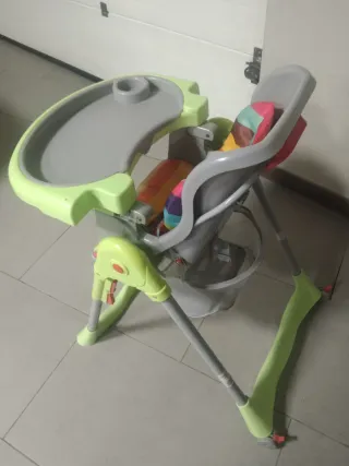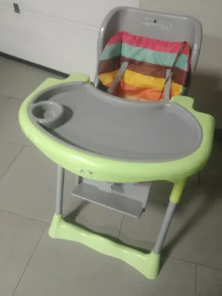 Trona de bebé con bandeja extraíble y asiento acolchado. - Estructura de metal y plástico. - Bandeja gris con portavasos. - Asiento con cojín multicolor. - Patas verdes ajustables.