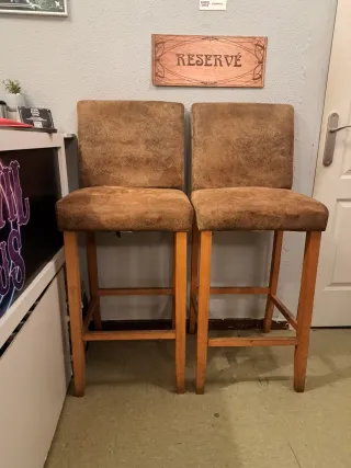Par de taburetes altos con estructura de madera y asiento tapizado en ante. - Diseño moderno y elegante. - Asientos cómodos y resistentes. - Perfectos para barra de cocina o bar.