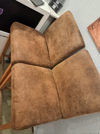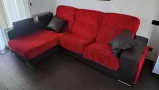 Sofá chaiselongue en buen estado, URGE VENTA - Tapicería de tela y polipiel. - Amplio espacio de almacenamiento bajo el asiento. - Incluye dos cojines decorativos marrones. - Cabeceros reclinables - Asientos deslizables - 2 puff - Fundas de cojines incluidas - 280 ancho 95 fondo 165 largo chaiselonge