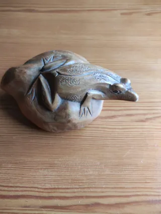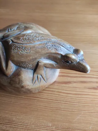 Figura decorativa de una rana, elaborada artesanalmente con un estilo vintage. - Diseño detallado de la rana. - Material de madera. - Pieza única con carácter.