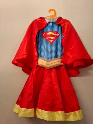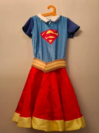 Disfraz de superhéroe para niña, inspirado en Supergirl o Superman, con capa. Talla L de niña. 10-13 años mas o menos - Diseño con el escudo de Superman en el pecho. - Cuerpo del traje a cuadros azules. - Cinturón dorado. - Falda roja. - Detalle de banda dorada en el bajo de la falda. - Capa roja.