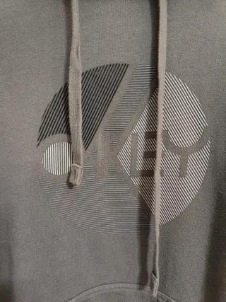 Sudadera con capucha Oakley gris talla M, en buenas condiciones con uso mínimo. Tejido suave, logo "Oakley" grande en pecho, capucha con cordón, bolsillos canguro, estilo streetwear deportivo ideal para casual o deporte.