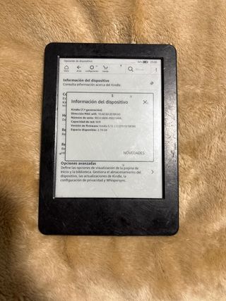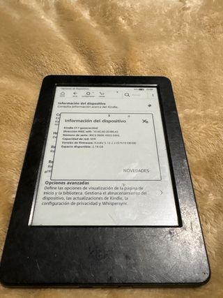 Este es un Kindle de 7ª generación en color negro. Es un dispositivo ligero y fácil de usar para leer tus libros favoritos. - Modelo: Kindle (7ª generación) - Dirección MAC wifi: 10:AE:60:20:88:A5 - Número de serie: 9006 0606 4502 04HL - Versión de firmware: Kindle 5.12.2.2 - Espacio disponible: 2.19 GB