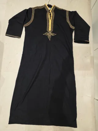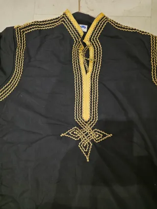 Túnica de estilo egipcio para hombre, ideal para disfraces o eventos temáticos. Presenta un diseño llamativo con bordados dorados. - Cuello redondo con detalle de cordones. - Mangas 3/4. - Bordados dorados en el cuello y el pecho.