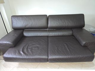 Sofá de tres plazas con mecanismo deslizante y reclinable. Sus dimensiones son 210 cm de ancho. ✅ Asientos deslizantes (más profundidad y comodidad) ✅ Cabezales reclinables/ajustables ✅ Medida ideal: 210 cm largo x 105 cm fondo (cerrado) ✅ Tapizado tipo piel sintética fácil limpieza ✅ Diseño actual, cómodo para salón principal - Tapicería de piel. - Color marrón.