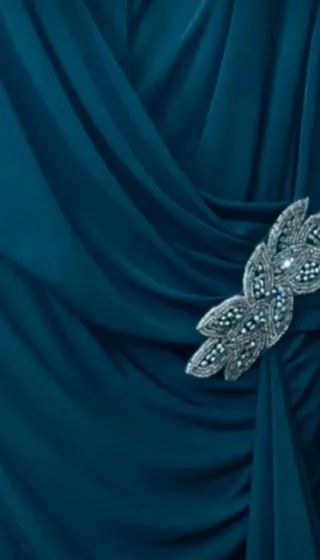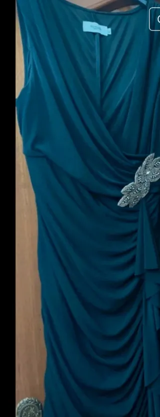 Elegante vestido de cóctel con un diseño cruzado y drapeado. - Detalle de broche plateado con pedrería. - Falda con volantes y fruncidos. - Tirantes finos.