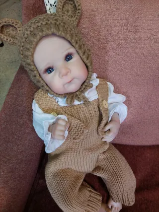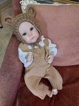 Muñeco bebé reborn con un adorable gorro de oso. - Gorro de lana tejido con orejas, peso dos kilos aproximadamente, vinilo cuerpo blando, movimientos realistas incluye chupete - Mono de punto marrón. - Camisa blanca con volantes.