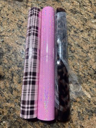 Dos rollos de hojas de vinilo con diferentes diseños. - Un rollo con estampado de cuadros tartán en tonos rosas y marrones. - Un rollo con acabado brillante y purpurina en color rosa.
