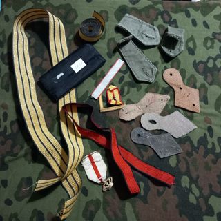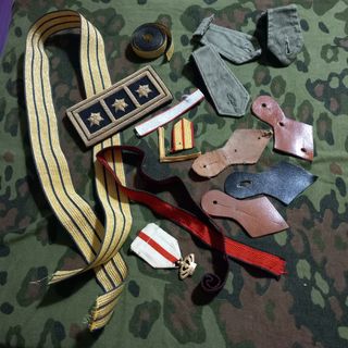Lote de cintas y efectos militares varios. La longitud de la cinta ancha dorada/azul es de 3 cm ancho y 75 cm de largo. La cinta roja mide 1,5 cm de ancho y 51 cm de largo. La cinta dorada estrecha mide 91 cm de largo.