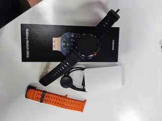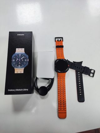 Reloj Samsung Galaxy Watch Ultra con su caja original y accesorios. - Correa naranja. - Correa negra adicional. - Cargador inalámbrico.