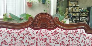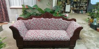 Elegante sofá de estilo isabelino con detalles tallados. - Estructura de madera de caoba. - Tapicería con estampado floral en rojo y blanco. - Diseño clásico y ornamentado.
