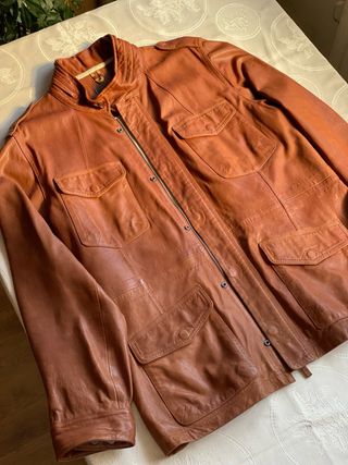 Chaqueta de piel Timberland para hombre en color marrón/camel fit-slim. Un clásico con un diseño atemporal. - Cuatro bolsillos frontales con solapa y botón. - Cierre de cremallera y botones. - Cuello alto con cierre de botón. - Puños ajustables con botón. Se ha usado dos veces, esta en perfectas condiciones. No hay signos de desgaste. Oportunidad!!! 🔥 #timberland #columbia #armani #calvinklein #tomyhilfiger