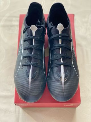Botas de fútbol Puma para hombre en color negro con detalles blancos. - Diseño deportivo. - Cierre con cordones. - Tacos para césped. *bien cuidadas.