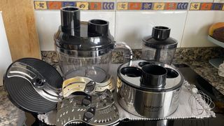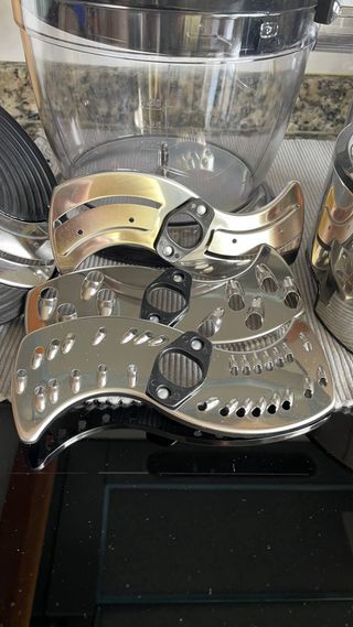 Conjunto de accesorios para batidora multifunción Hotpoint Ariston. - Incluye cuchillas para picar y triturar. - Discos ralladores y laminadores. - Varillas batidoras. - Recipientes de plástico y acero inoxidable. NO INCLUYE Brazo principal porque es el que está averiado y motivo por el que vendo estos accesorios