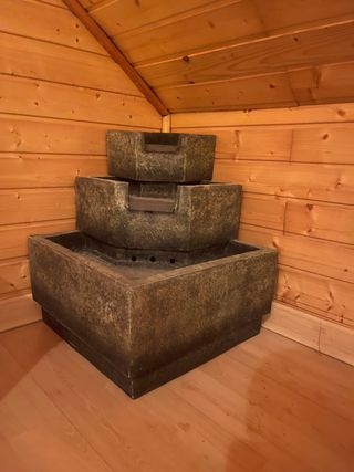 Acuario de cristal con tapa negra y adornos interiores. - Forma curva. - Incluye rocas y un recipiente amarillo.