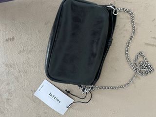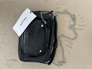 Bolso pequeño de Lefties en color negro, con un diseño moderno y práctico. - Asa de cadena metálica. - Bolsillo frontal con cierre de botón. - Cierre principal de cremallera. - Medidas: 13,5 cm alto x 18 cm ancho). - Tipo cuero.