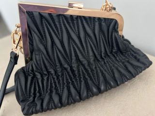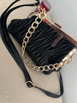 Elegante bolso negro con detalles dorados. - Diseño fruncido. - Cadena metálica dorada. - Cierre de broche. - Medidas: 17 cm largo x 27 cm parte mas ancha). - Tipo cuero.