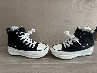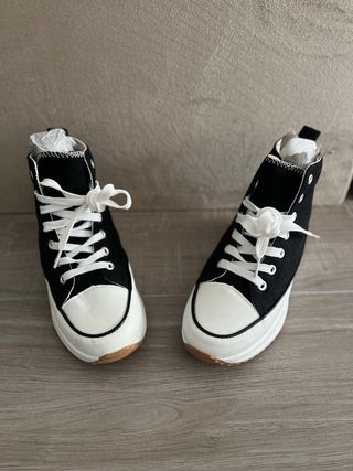 Zapatillas altas con plataforma en color negro y blanco. - Cierre con cordones blancos. - Suela de plataforma gruesa. - Diseño tipo Converse. - Medida sobre 24 cm. - En la última foto se detalla la pequeña rascada que tiene).