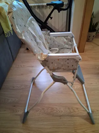 Trona de bebé con un diseño moderno y práctico. - Estructura plegable para fácil almacenamiento. - Tapicería con estampado de triángulos. - Arnés de seguridad.