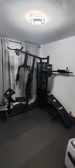 Equipo de gimnasio multiestación marca behumax multigym 500 en color negro con detalles en azul. - Asiento y respaldo acolchados. - Barra de dominadas integrada. - Banco ajustable. - Practicamente sin uso se puede apreciar en las fotos.