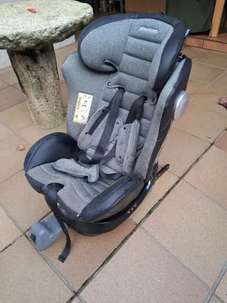 Silla de coche para bebé, marca Playxtrem, con diseño moderno y funcional. - Tapicería gris y negra. - Sistema de arnés de seguridad. - Base giratoria.