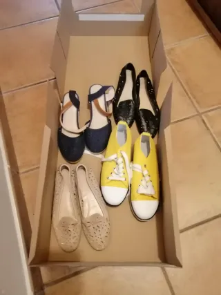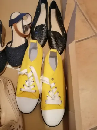 Lote de cuatro pares de zapatos variados. - Un par de zapatillas deportivas amarillas con cordones blancos. - Un par de zapatos planos negros con detalle de tachuelas. - Un par de sandalias azules con tiras. - Un par de zapatos planos beige calados.