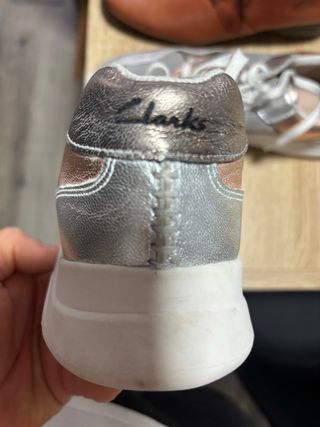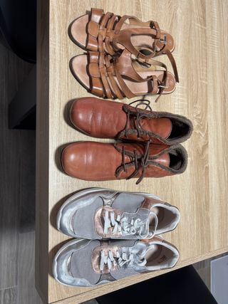 Lote de tres pares de calzado variado. - Sandalias de tiras en tono marrón 40 - Botines de piel con cordones 39 - Zapatillas deportivas en plateado y rosa 39,5 marca clarks.