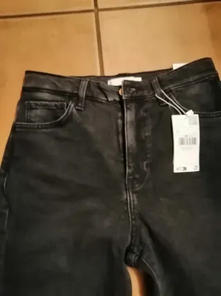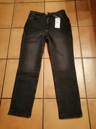 Vaqueros de la marca Mango en color negro, envio por in post - Corte recto. - Tiro alto. - Lavado desgastado.