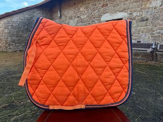 Mantilla acolchada con diseño de rombos en color naranja y ribete azul marino y plateado. Está usada pero en bye estado y sin manchas. Talla COB. Marca BR.