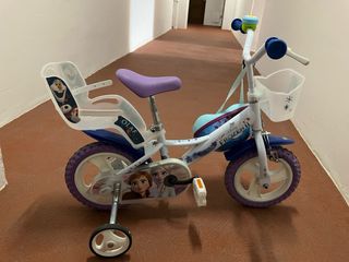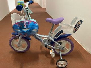 Bicicleta infantil temática de Frozen, con un diseño divertido y colorido. Incluye un casco a juego para mayor seguridad. Tiene dos usos reales, está como nueva. - Asiento morado. - Canasta delantera blanca. - Ruedines de apoyo. - Diseño de Olaf y Elsa.