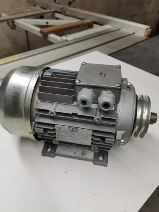 Motor eléctrico trifásico de la marca CEG. Fabricado en aluminio. Motor trifásico de 4 caballos con polea incluida, estaba montado en una escuadradora y se cambio por uno monofasico