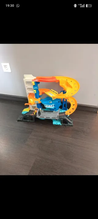 Divertida pista de Hot Wheels con temática de tiburón. - Incluye rampas y accesorios. - Diseño colorido con un tiburón. - Compatible con coches Hot Wheels.