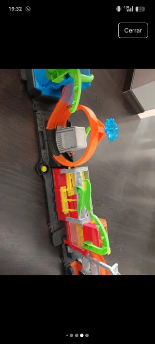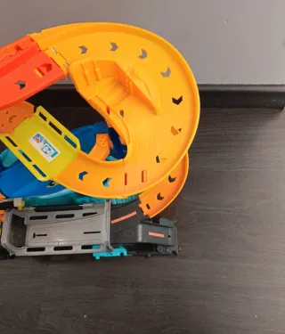 Pista de juego Hot Wheels con varios niveles y accesorios. - Incluye rampa y túnel. - Diseñada para coches a escala. - Colores vibrantes: rojo, naranja, verde y amarillo.
