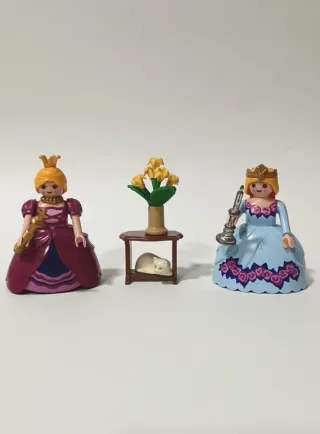 Set de figuras de Playmobil que incluye una reina y una princesa, junto con accesorios. - Figura de reina con corona dorada y vestido morado. - Figura de princesa con corona dorada y vestido azul. - Incluye un candelabro y un cetro. - Pequeña mesa con un jarrón de flores amarillas y un gatito blanco.