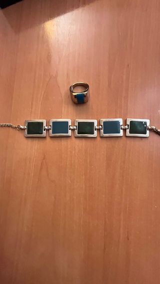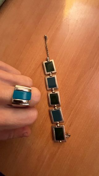 Conjunto de bisutería de la marca Bijou Brigitte. - Pulsera con eslabones rectangulares y detalles en verde y azul. - Anillo con piedra central azul y montura plateada