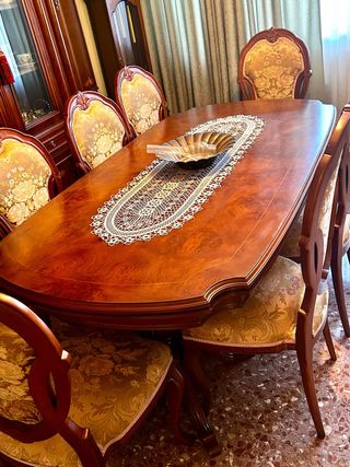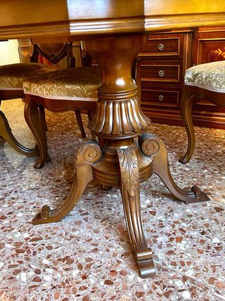 Elegante mesa de comedor con detalles tallados. - Acabado en madera de alta calidad. - Diseño clásico y sofisticado. - Es extensible hasta 3,80m