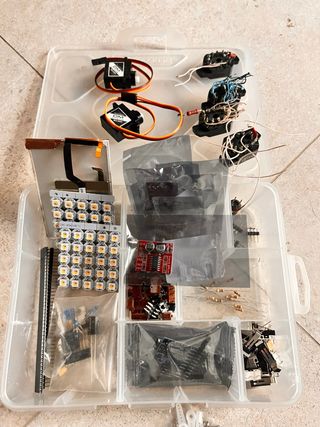 Lote variado de componentes electrónicos para proyectos. - Dos servos DM. - Módulo de pantalla. - Tira de LEDs blancos. - Varios componentes electrónicos como resistencias, condensadores y circuitos integrados. - Interruptores y conectores. ⚠️ Parte del material es nuevo, parte es usado ⚠️ Material procedente de proyectos personales ⚠️ No se vende por piezas, solo el lote completo ⚠️ No se garantiza funcionamiento individual de cada componente Ideal para makers, estudiantes o personas que saben trabajar con electrónica. Se vende como lote, tal cual se ve en las fotos.