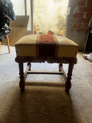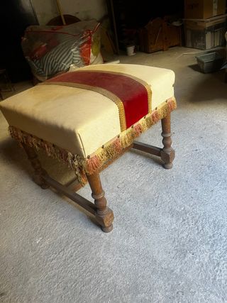 Este taburete antiguo combina tela y terciopelo con patas de madera. - Tapicería en tonos beige y rojo. - Adornado con flecos decorativos. - Estructura de madera robusta.