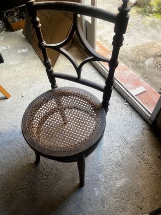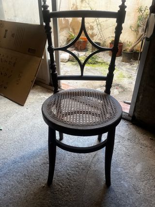 Conjunto de sillas antiguas con un diseño clásico y elegante. - Estructura de madera oscura. - Asiento de ratán tejido. Precio a Negociar